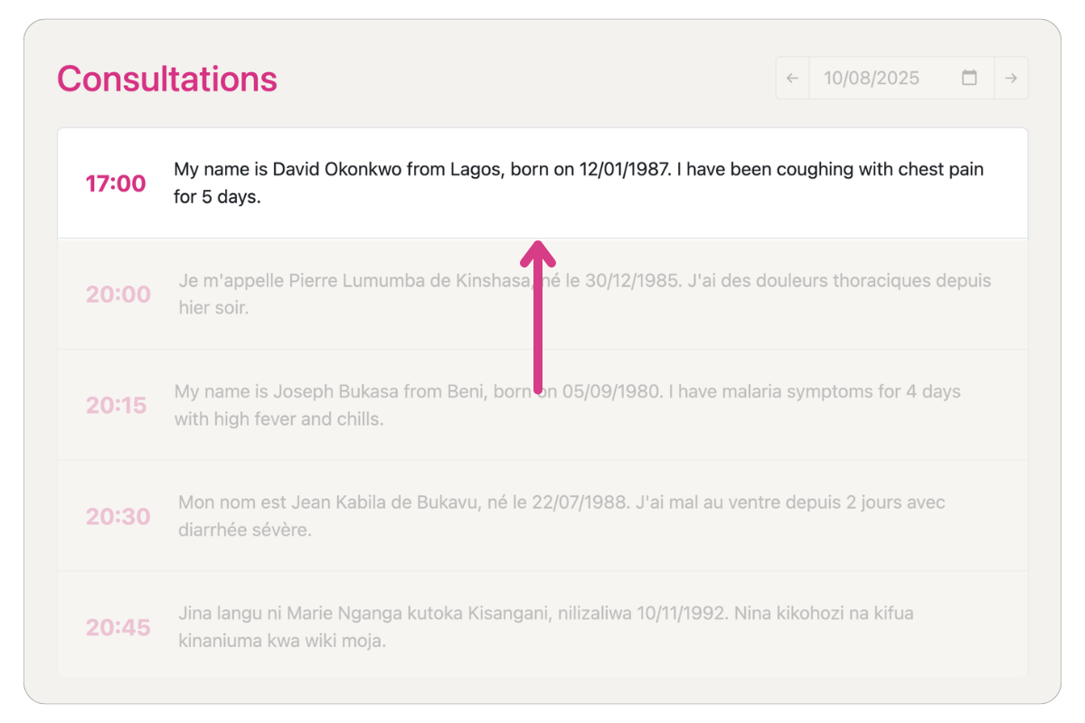Click on a consultation to open it. This will open the consultation page where you can call the patient, view the patient's details, and record the consultation outcome.