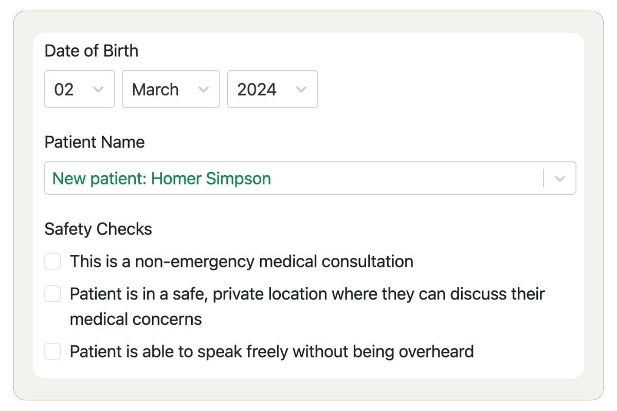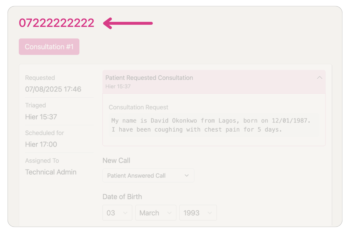 Once you have called the patient, you should identify yourself as a clinician and ask the patient to confirm their name and date of birth. This way you can safely identify the patient regardless of the phone number they used to book the consultation.
