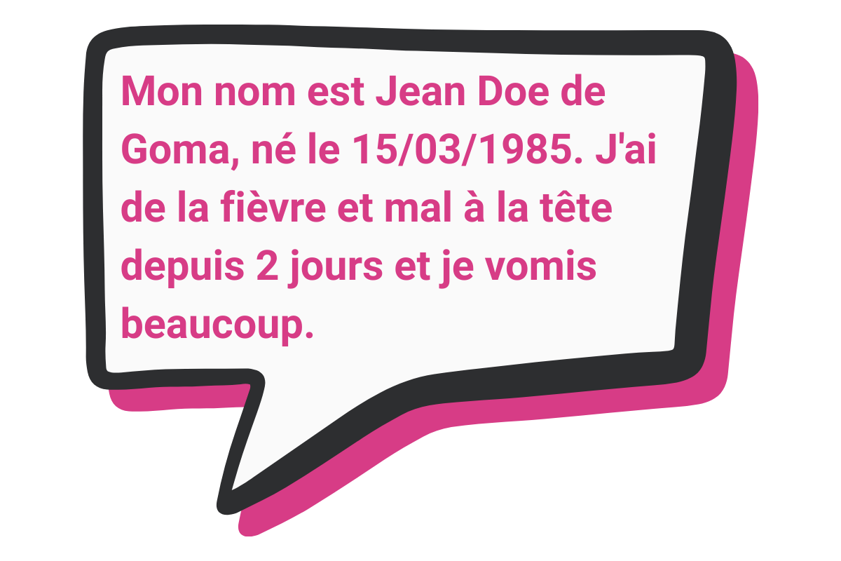 The patient sends an SMS to the designated phone number with their details including full name, date of birth, location, and symptoms.